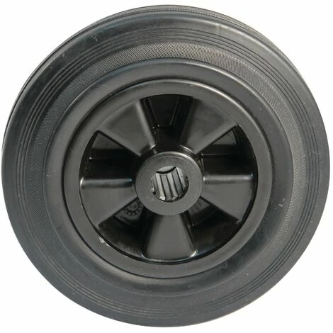 Roue à bandage caoutchouc semi-élastique noir.- Corps de roue nylon.- Alésage à rouleaux. – Pour manutention standard, charges moyennes.