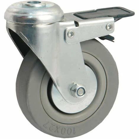 Roulette collectivité à chape à trou central en acier zingué. – Roue en caoutchouc gris.- Non tachante.- Alésage lisse.- Frein simple action ne bloquant que la roue.